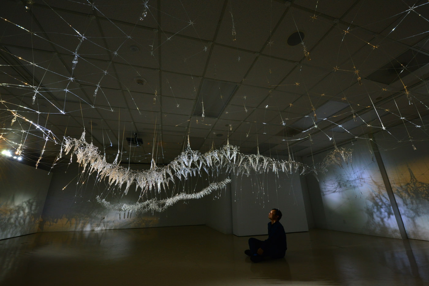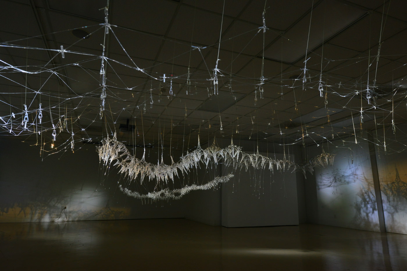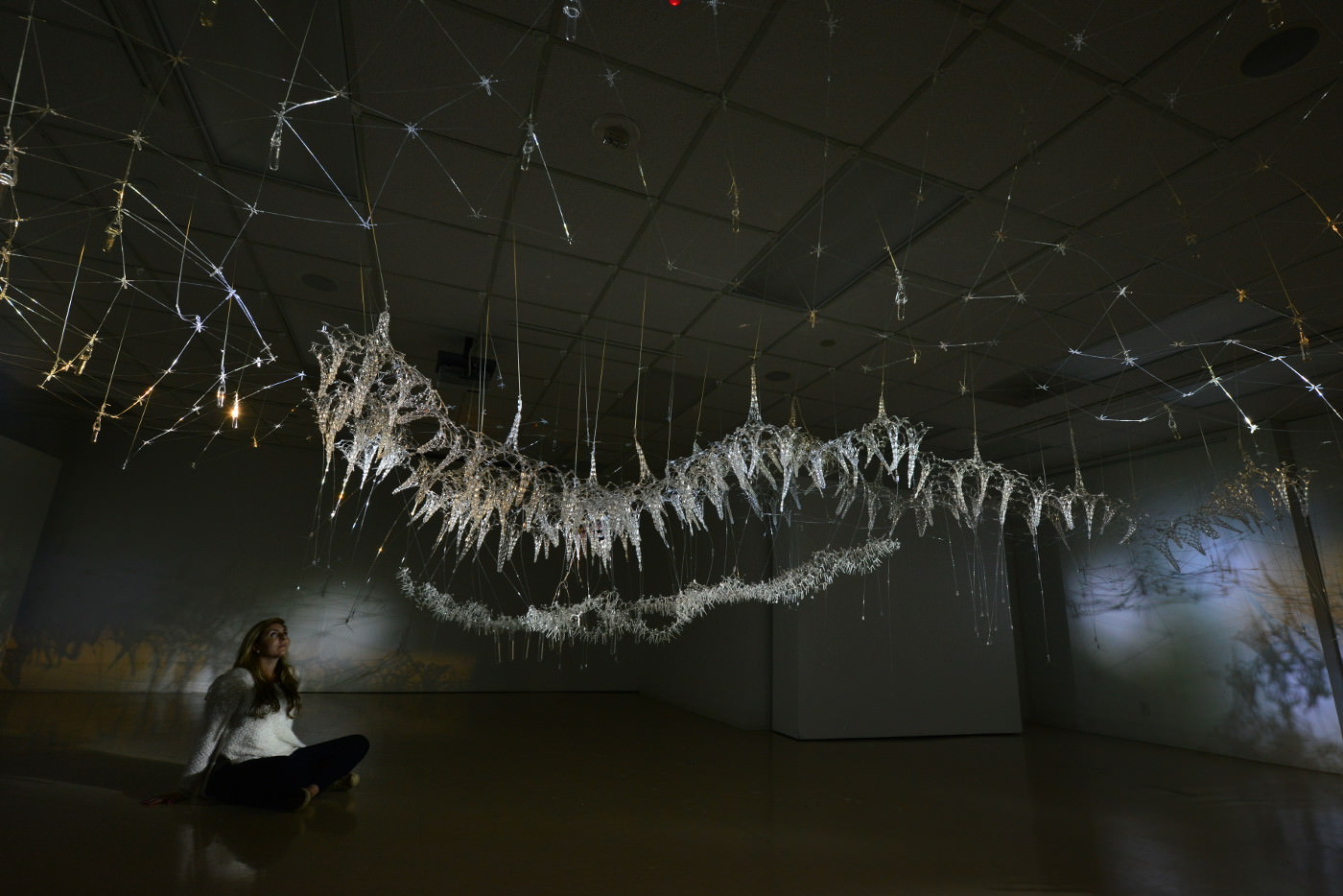 Hammock Veil was developed with students of Florida Atlantic University School (FAU) of Architecture, working with Associate Professors Mate Thitisawat and Emmanouil Vermisso. The work was designed February 2015 and presented at metroLAB of FAU School of Architecture from March 9 to April 3, 2015. Philip Beesley collaborated as visiting professor for the course entitled “Performative Parametric Design”. Students developed a conceptual environment Inspired by the interactive threshold where water and the hardwood hammock of the Everglades converge. Beesley, together with Professors Thitisawat, Vermisso, volunteers and fifteen architecture students, created an installation comprised of illuminated acrylic components integrated with sensor’s actuators and micro-controllers.