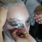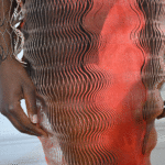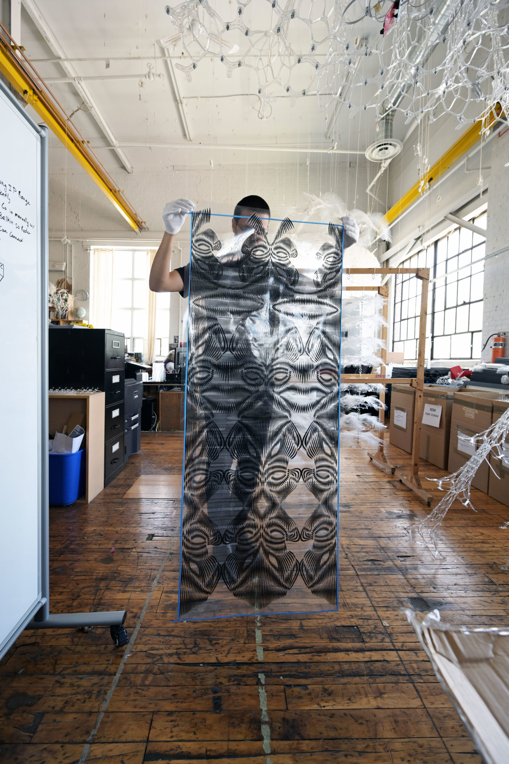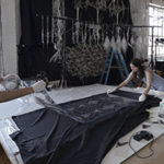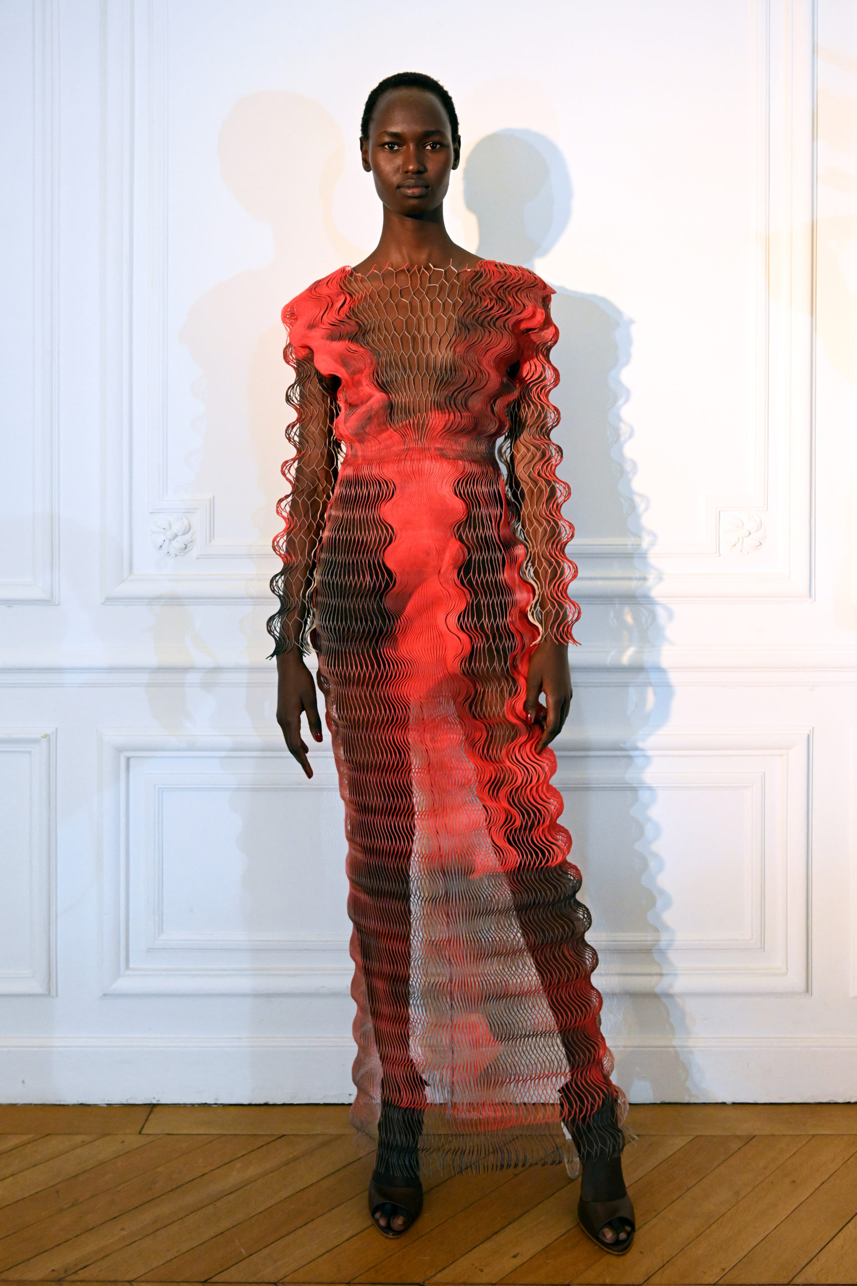 Iris van Herpen and Philip Beesley collaborated in the development of the material Glitch, which debuted in Iris van Herpen’s Spring 2019 collection Shift Souls. The material made another appearance in the Fall 2019 collection Hypnosis. Glitch is made by laser-cutting Mylar into computer-generated wave patterns, creating a rippling effect when draped on a body and oscillating as the wearer moves. The Shift Souls collection was inspired by early examples of celestial cartography and its representations of mythological and astrological chimera.