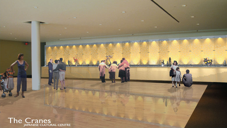 The Cranes: The National Tribute to Japanese Canadian Life is a collaboration between Philip Beesley and sculptor Kai Chan, that is located in the Auditorium Lobby of the new Japanese Canadian Cultural Centre building.