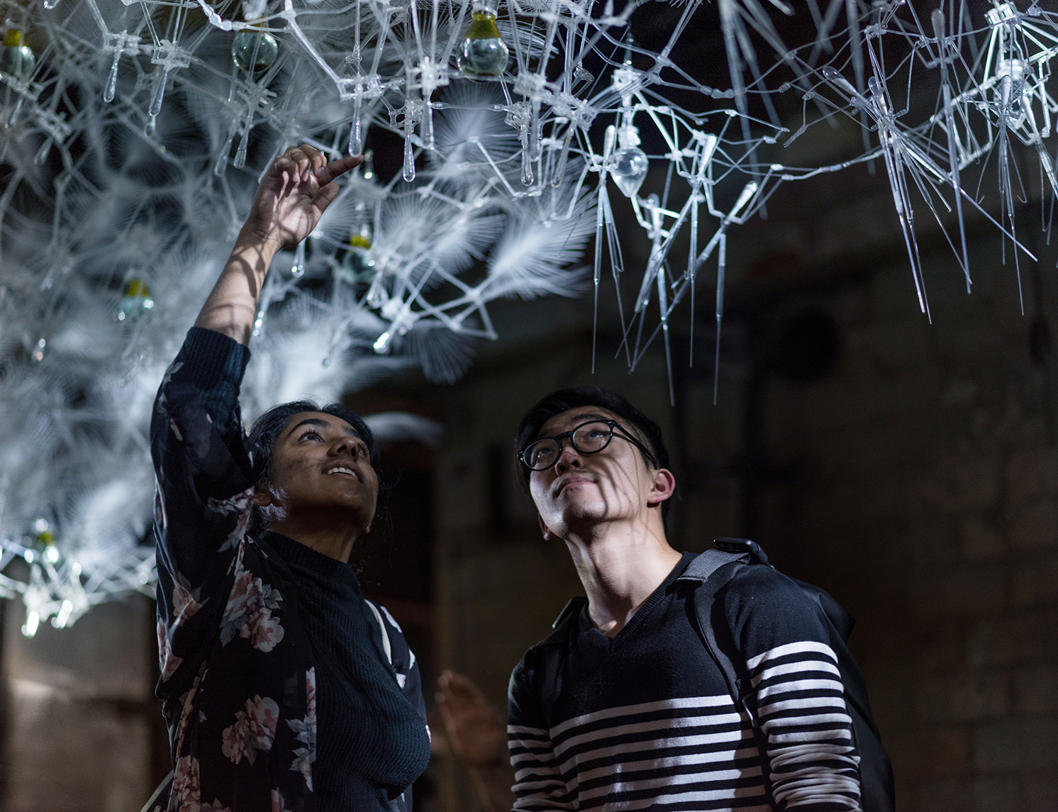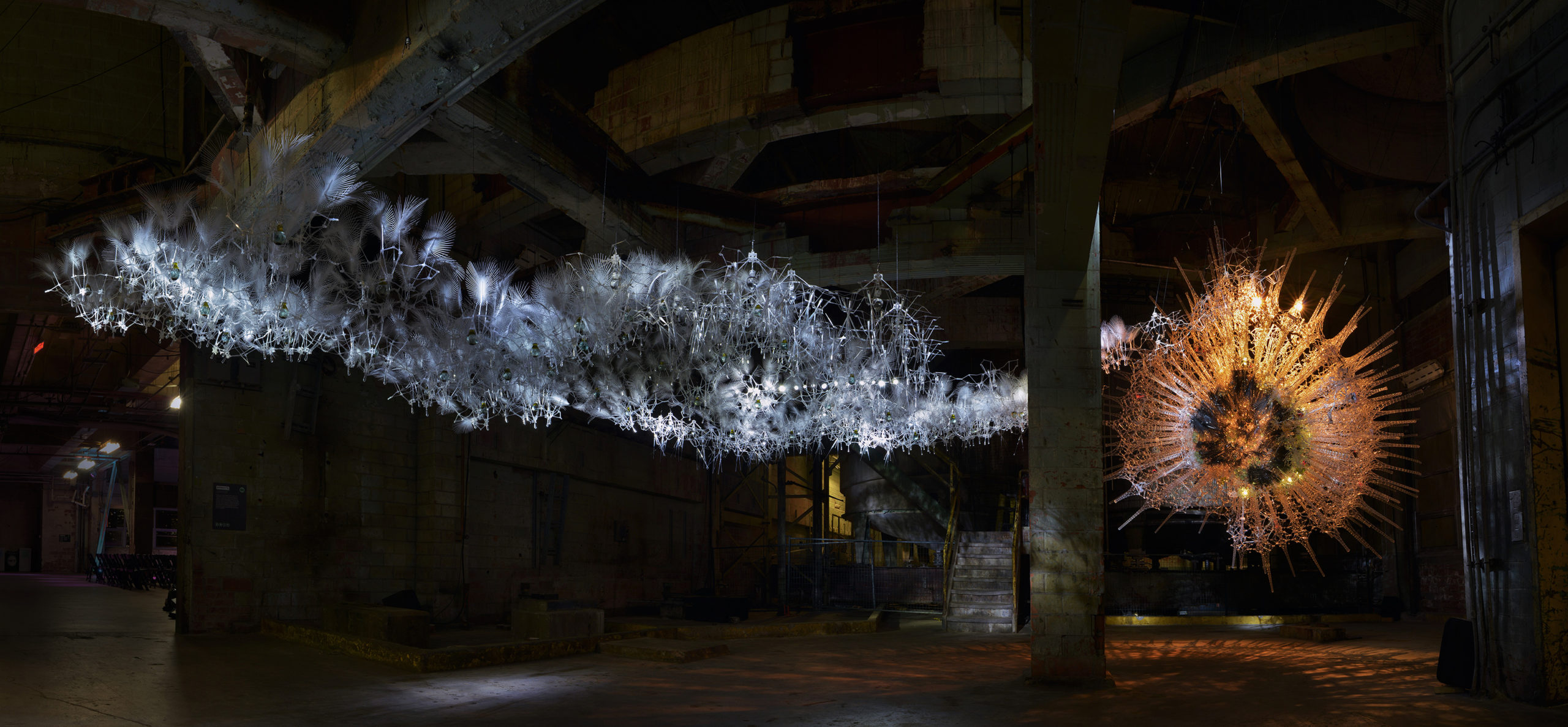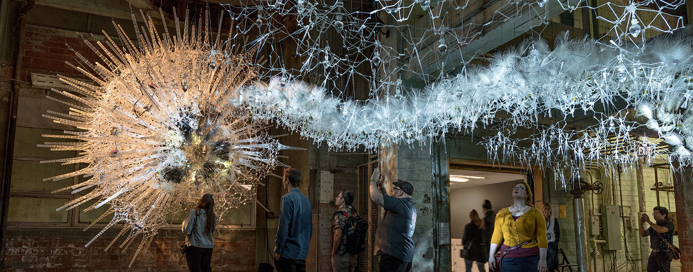 Astrocyte was a first-generation spherical meshwork construction with interactive light, kinetics and sound developed for DX EDIT: Expo for Design, Innovation & Technology. The environment was installed within an abandoned massive space within the Unilever Detergent Factory, an iconic structure that stands as a landmark at the waterfront termination of the Don Valley Expressway in Toronto. Referencing the Greek word “astro” meaning star, and “kytos” meaning cell, Astrocyte was a floating sculpture of 300,000 components made of thermally-formed acrylic, mylar fronds, electronic sensors, 3D printed lights, inorganic chemicals and custom glasswork. The sculptural work merged chemistry, artificial intelligence and immersive soundscapes.