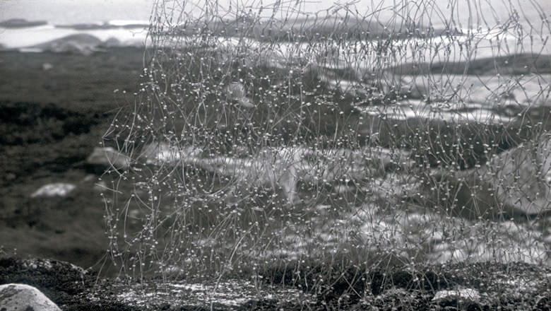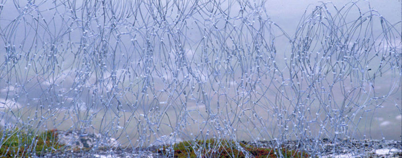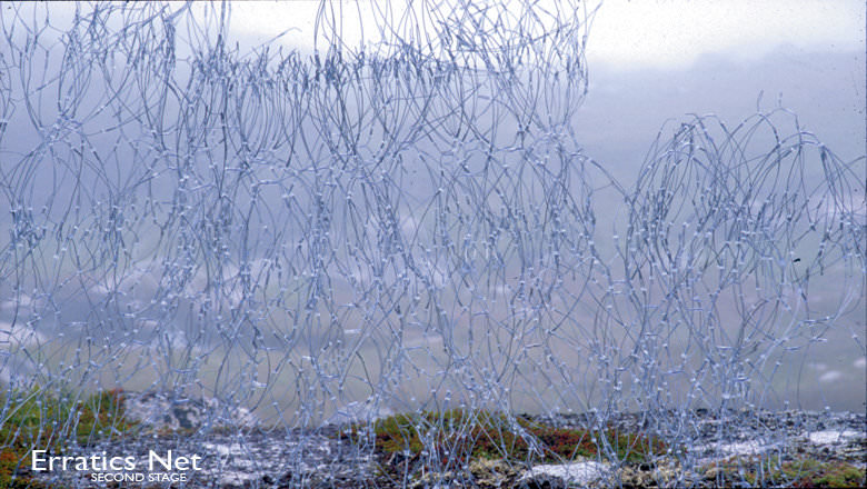 A foam-like cellular lattice results, a filigree extending throughout the thickened atmosphere. The natural growth encouraged by this armature is froth-like, filling space with infinitesimal mass. The material is marked by regular intervals, momentarily thickening and making a porous stratified border then opening again. A striated penumbra emerges, an aura floating outward from the land. Like plankton phosphorescing in the ocean, Erratics Net offers dissociated space, an absorption into ether. In this state, the textile is organized in a pillowed form of alternating peaks and valleys, presenting barbs outward catching new material and inward for anchoring beneath. These anchors hold the net just above the bare rock, making a shallow film of still, sheltered air allowing delicate growth to emerge. The net is made with wire joints clamped by sliding flexible tubes that lock each link to its neighbour making a tough, resilient structure.