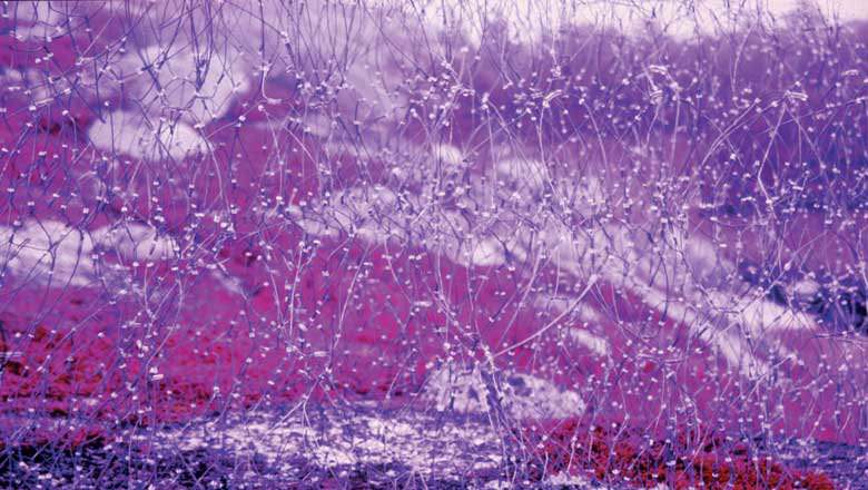 A second stage of the installation Erratics Net was developed in collaboration with Waterloo architect Caroline Munk, fall 1998. The second state responds to extended times of deep fog where the air stills and the ground is soaked in vapour. Responding to this state the net can expand into multiple layers, each outward facing peak formed within a matrix layer in turn serving as the foot for an inward facing valley of the next layer.