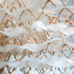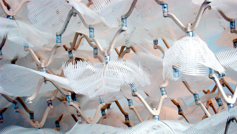 Gill Array is a dense, lightweight spatial matrix incorporating a tetrahedral structure of cast ceramic elements with ‘gills’ of translucent laser-cut mylar. Pinned at the intersections of the ceramic units, the gills shift in response to air movement within the array. Complex optical interference patterns are produced by the many layers of mylar screens and porcelain skeletons.