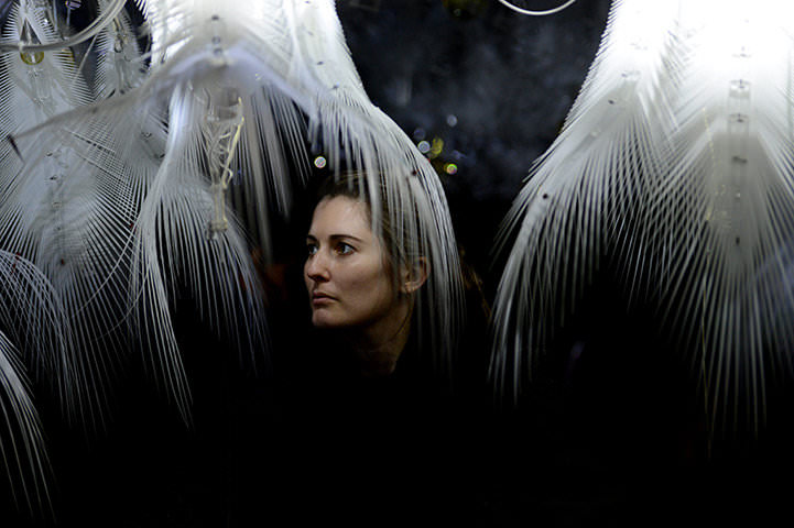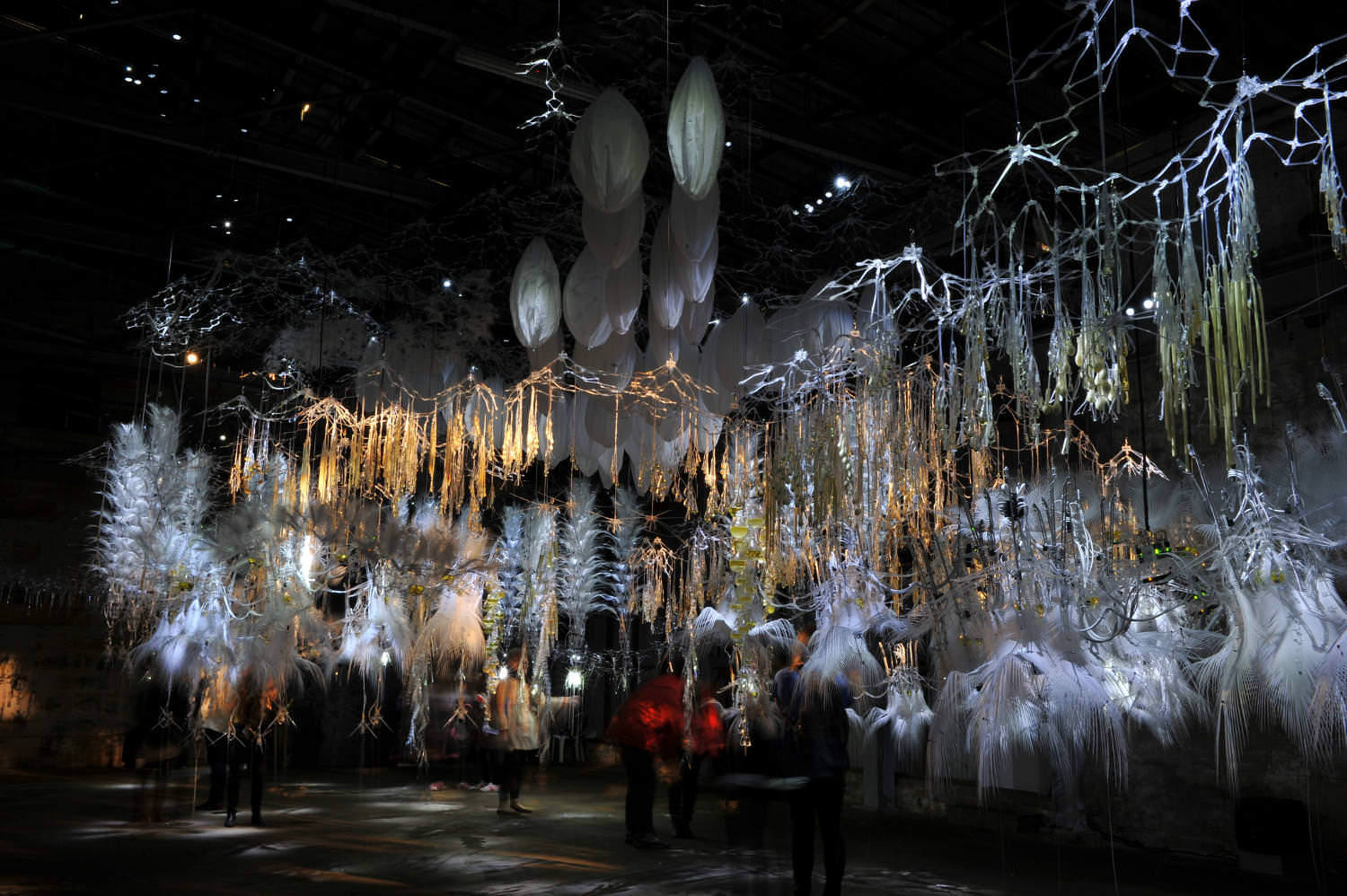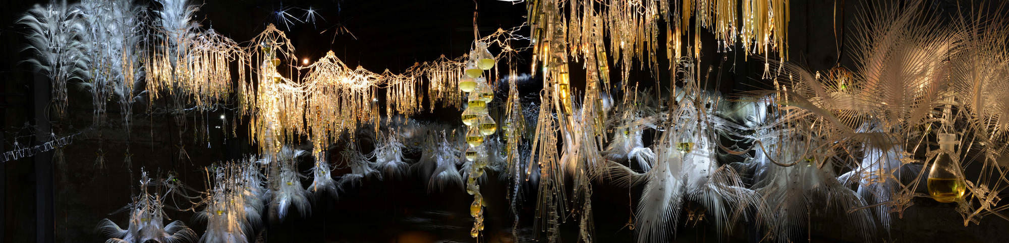 Sibyl was presented as part of the 18th Biennale of Sydney from June 27 – September 16, 2012. The work was installed within a massive basilica-like hall of stone and metal trusswork lying within a historic shipbuilding complex on Cockatoo Island within the harbour of Sydney. The space of the sculpture intersected a high, central passage and reached back into a recess that provided a shelter of darkness and quiet. Rivers of delicate hexagonal skeleton filters reached high overhead and spiraled down to surround an intimate room within the centre.