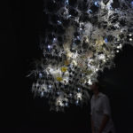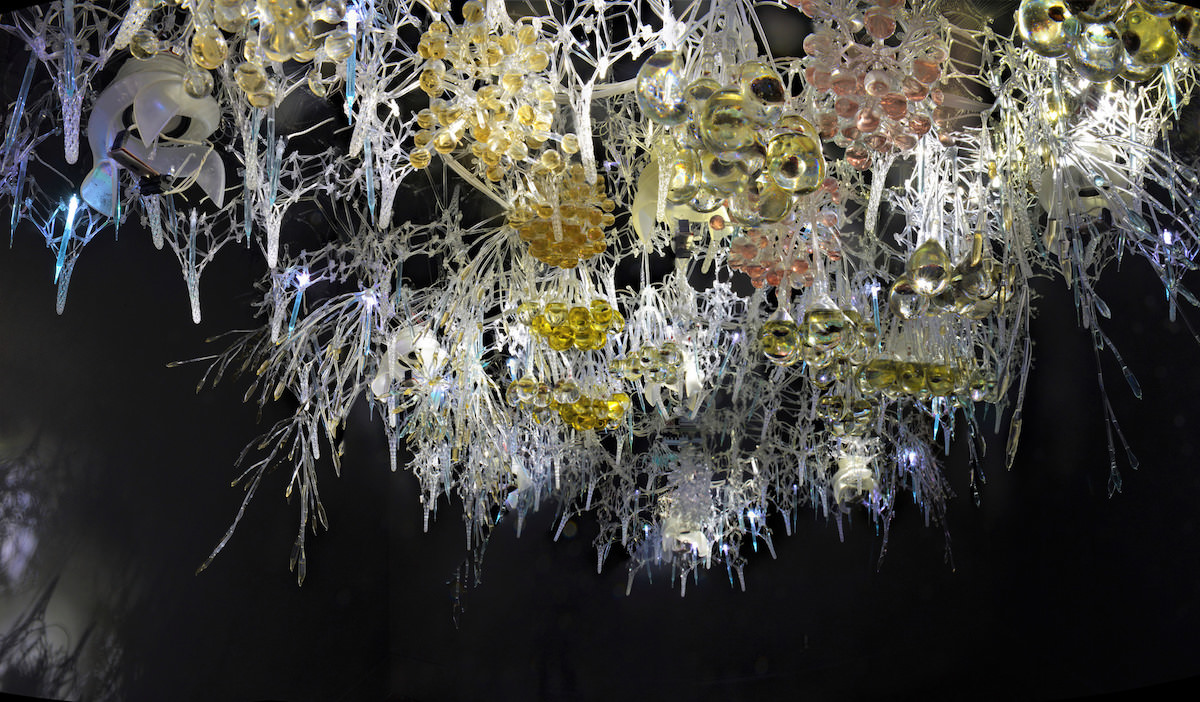 Sentient Veil is a jewel-like canopy containing multiple miniature sound processors interwoven with hundreds of digitally controlled lights installed within the historic galleries of the Isabella Stewart Gardner Museum. The work pursues intimacy and sensitivity through intricate miniature components and layers of diffusive, hovering material close to the scale of a human body. Sentient Veil is composed of digitally fabricated cellular textile lining floating over the ceiling surface of the gallery. The work is composed of finely detailed interlinking skeletal components containing distributed computational controls with soft LED lighting and whispering interactive sound functions. Movement of visitors within the space trigger choruses of whispering responses emanating from miniature custom acoustic resonators integrated within the fabric of the sculpture. Glass vessels containing chemical protocells and carrying interactive LED lighting are also integrated within the sculpture.